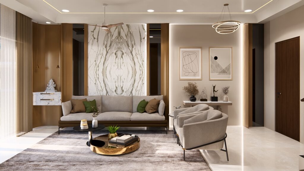 Luxurious bungalow interiors reflecting personal style and comfort, featuring spacious layouts, high-end materials, and bespoke furnishings that create warm, inviting living environments for families.